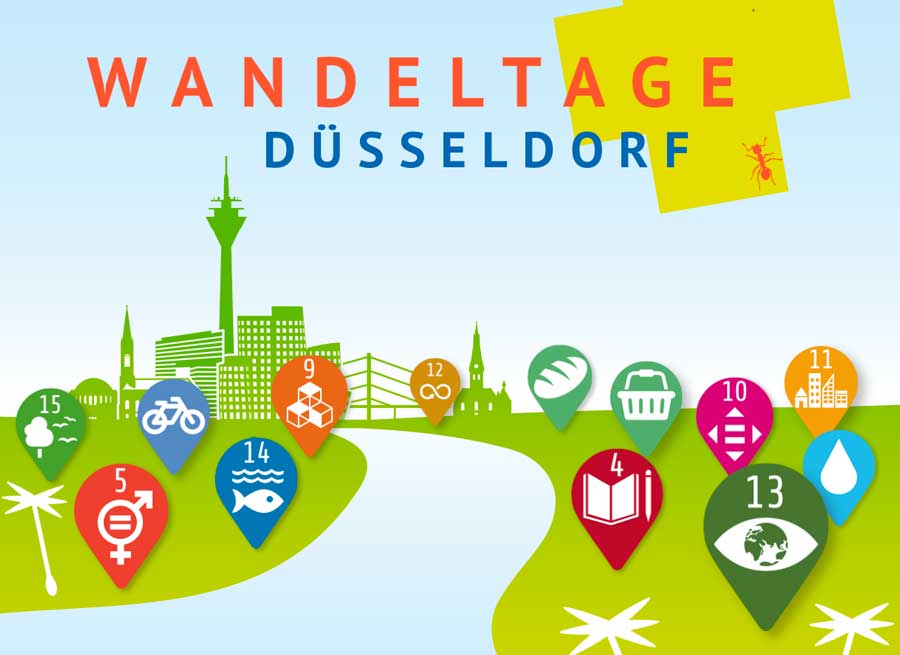 Vier Wochen später riefen Norman aus der Geschäftsstelle Nachhaltigkeit und Anke aus dem BNE-Büro des Düsseldorfer Umweltamtes an mit der Frage, ob sie die Wandeltage »kopieren« und dafür auch unsere Webseite nutzen dürften. Darüber haben wir uns natürlich sehr gefreut. Es war zwar viel Arbeit, das so kurzfristig gemeinsam hin zu kriegen, aber es gibt jetzt eine Düsseldorfer Regionalseite und man kann vom 22. Juli bis 29. August unter unserem Wandeltage-Motto von 2018 »Wer urlaubt am zuhausesten?« Nachhaltigkeit in und um Düsseldorf erleben.